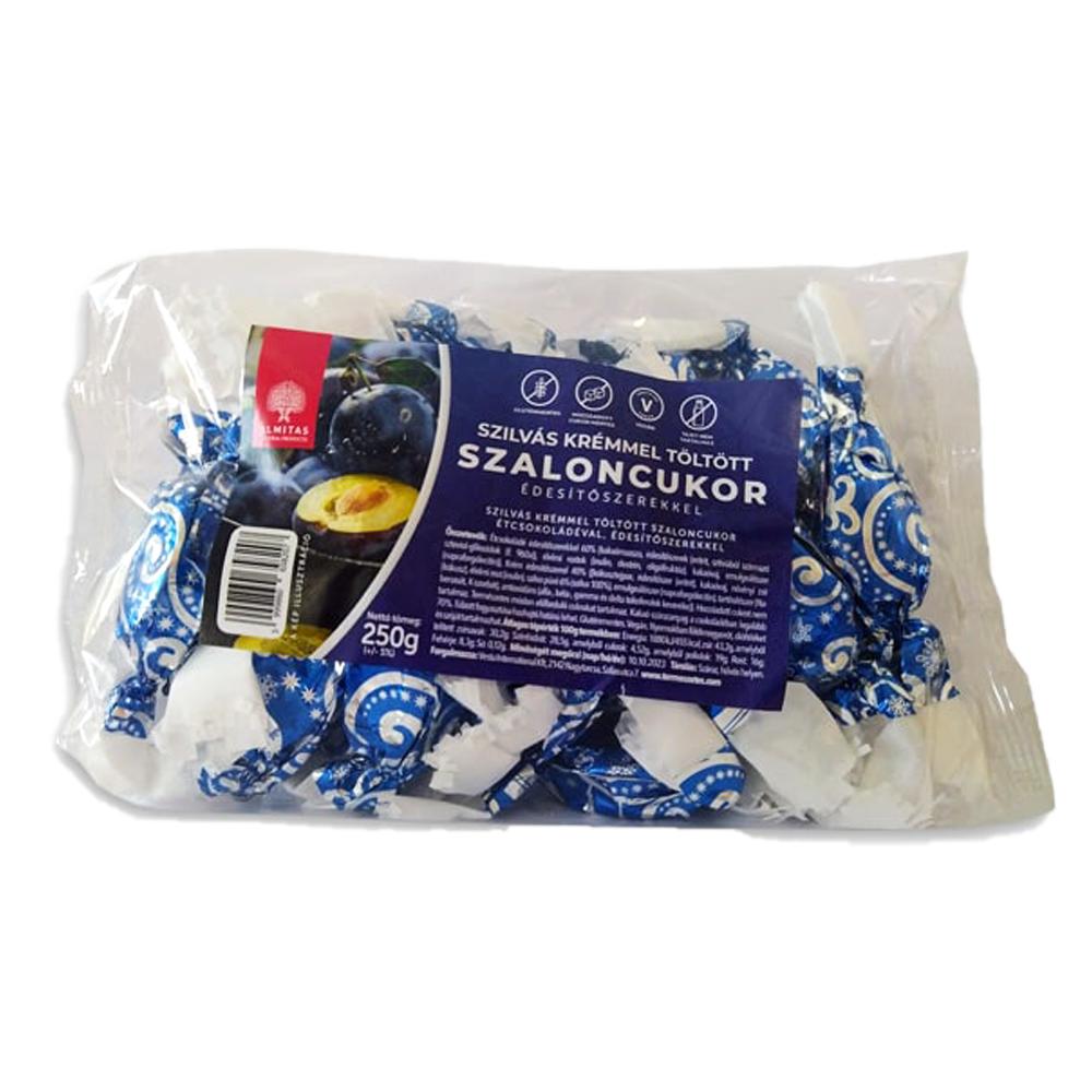 Ingrediente: ciocolata neagra cu indulcitori 60% {masa de cacao, indulcitori (eritritol, din stevia glicozide de steviol (E 960a)), fibre alimentare (inulina, dextrina, oligofructoza), unt de cacao, emulgator (lecitina de floarea soarelui)}, Crema cu indulcitor 40% ({lapte de cocos praf, indulcitor (eritritol), unt de cacao, grasime vegetala (nuca de cocos), fibre alimentare (inulina), piure de prune 6% (prune 100%), emulgator (lecitina de floarea soarelui), conservant (Na-benzoat, K-sorbat), antioxidant (amestec de tocoferoli alfa, beta, gamma si delta)}.