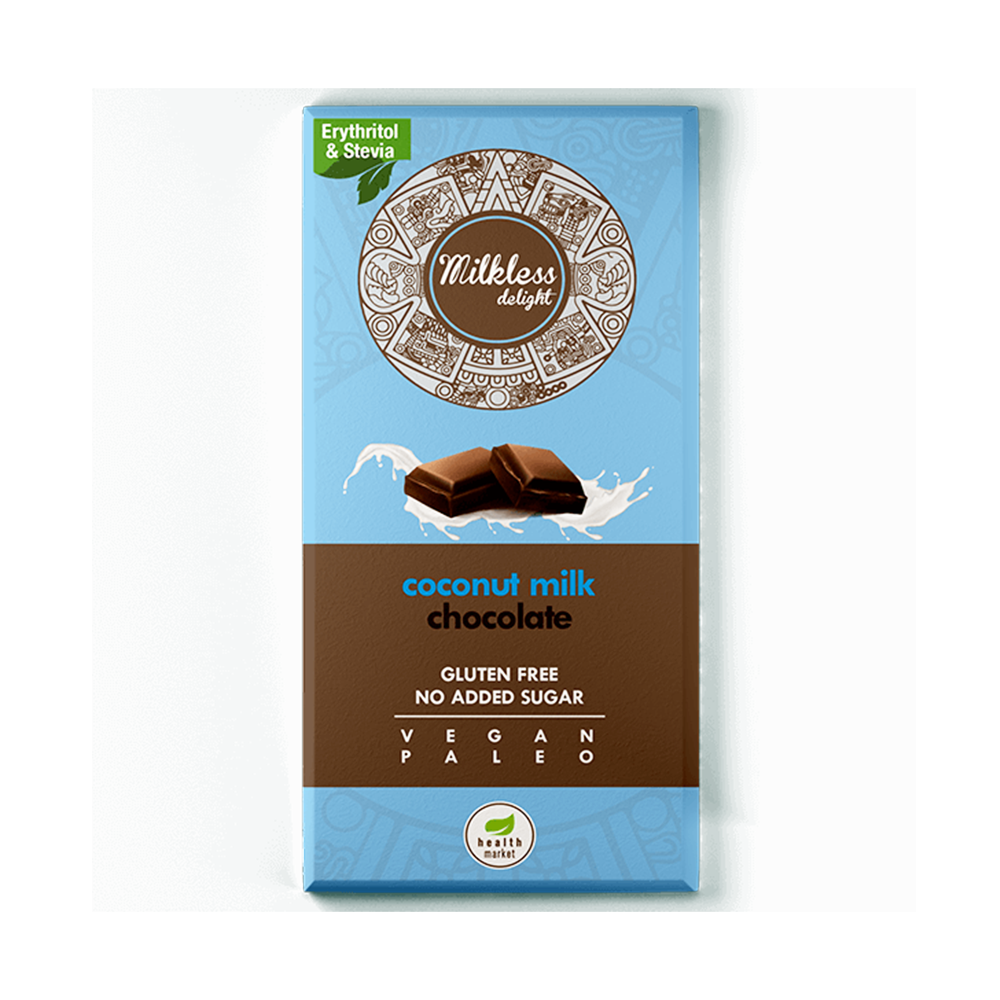 Ingrediente: unt de cacao, lapte praf de cocos (19%), indulcitor: eritritol (16%), fibre alimentare (polidextroza, inulina), pudra de cacao degresata, amidon de tapioca, emulgator (lecitina de floarea soarelui), aroma, indulcitor: glicozide steviol ( 70 mg/kg). Continut de gluten <20mg/kg. Ambalat intr-o unitate care proceseaza fructe cu coaja lemnoasa, lapte si alune.