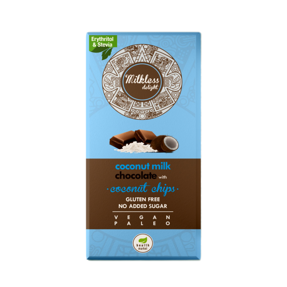 Ingrediente: unt de cacao, pudra de lapte de cocos (17%), indulcitor: eritrit (15%), fibre alimentare (polidextroza, inulina), pudra de cacao cu continut scazut de grasimi, amidon de tapioca, fulgi de cocos (3%), emulsifiant (lecitina de floarea-soarelui), aroma, indulcitor: glicozizi de steviol. Continut de gluten <20mg/kg. Ambalat intr-o unitate care proceseaza fructe cu coaja lemnoasa, lapte si alune.