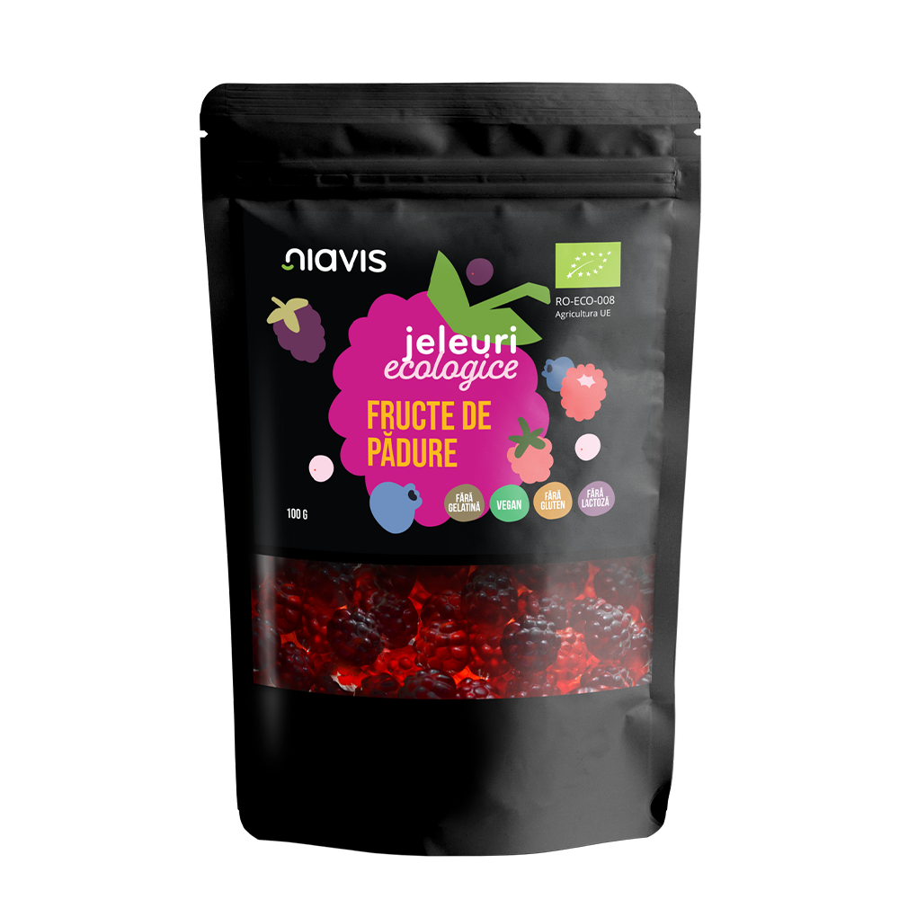 Jeleuri ecologice fara gelatina, sub forma de fructe de padure, cu gust de zmeura, afine, mure si coacaze negre.