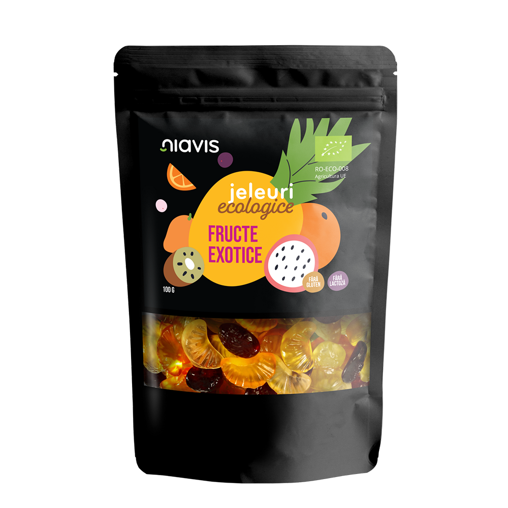 Jeleuri ecologice sub forma de fructe, cu gust de ananas, kiwi, lamaie, mango, portocala, piersica, fructul pasiunii.