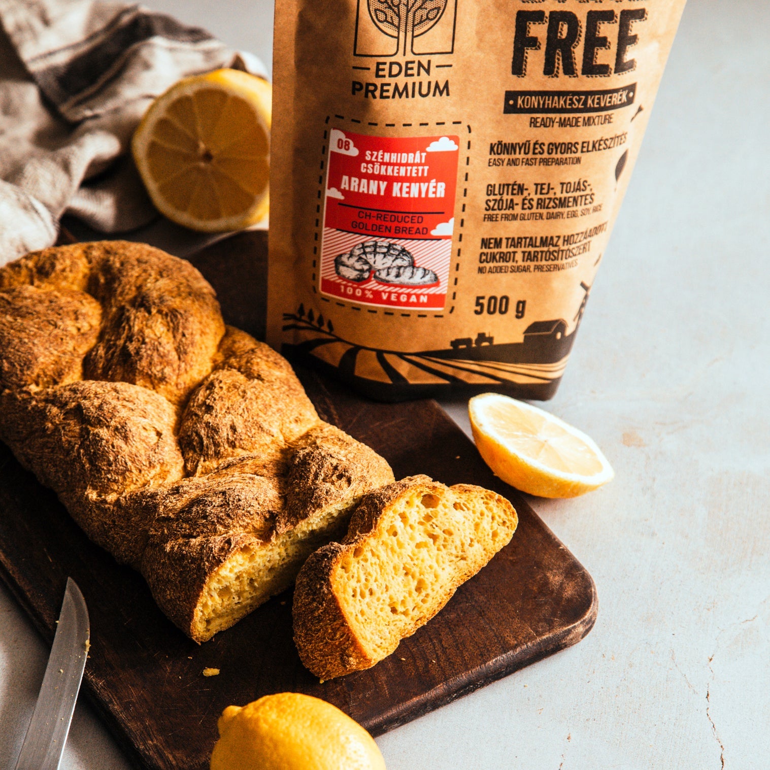 Amestec de faina cu continut redus de carbohidrati*, fara gluten, fara lapte, fara oua, fara soia, fara cartofi, fara amidon adaugat, fara orez, vegan, pe baza de plante, bogat in fibre alimentare, chiar si fara zahar adaugat, fara grasimi adaugate, destinat pentru prepararea painii si produselor de patiserie cu adaos de drojdie sau praf de copt.