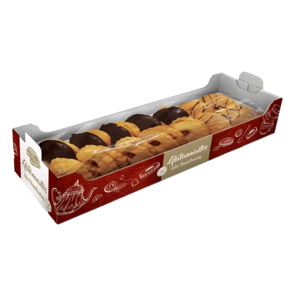 Isler: margarina [grasimi vegetale (palmier), ulei vegetal (rapita), apa, sare de masa, emulgator: mono- si digligerizi ai acizilor grasi, lecitina de floarea soarelui, conservant: acid sorbic, aroma de unt, reglator de aciditate: acid ascorbic, colorant: beta caroten], amidon (porumb, cartofi), zahar pudra, grasime de porc, 16% gem de caise (pulpe de mere, pulpe de caise, zahar, reglator de aciditate: acid ascorbic, conservant: sorbat de potasiu, dioxid de sulf), 8% invelis de cacao [zahar, grasime vegetala partial hidrogenata (palmier), pudra de cacao degresata min. 15%, emulagor (lecitin, poliricinoat de poliglicerol)], ou, faina de mei, faina de porumb, faina de orez, zahar vanilinat ( zahar, cristalina de vanilie), praf de copt (agenti de crestere: carbonati de potasiu, diosfati, amidon de porumb), fibre alimentare (mere, mambus), agent de ingrosare: guma de xantan, guma de guar.
