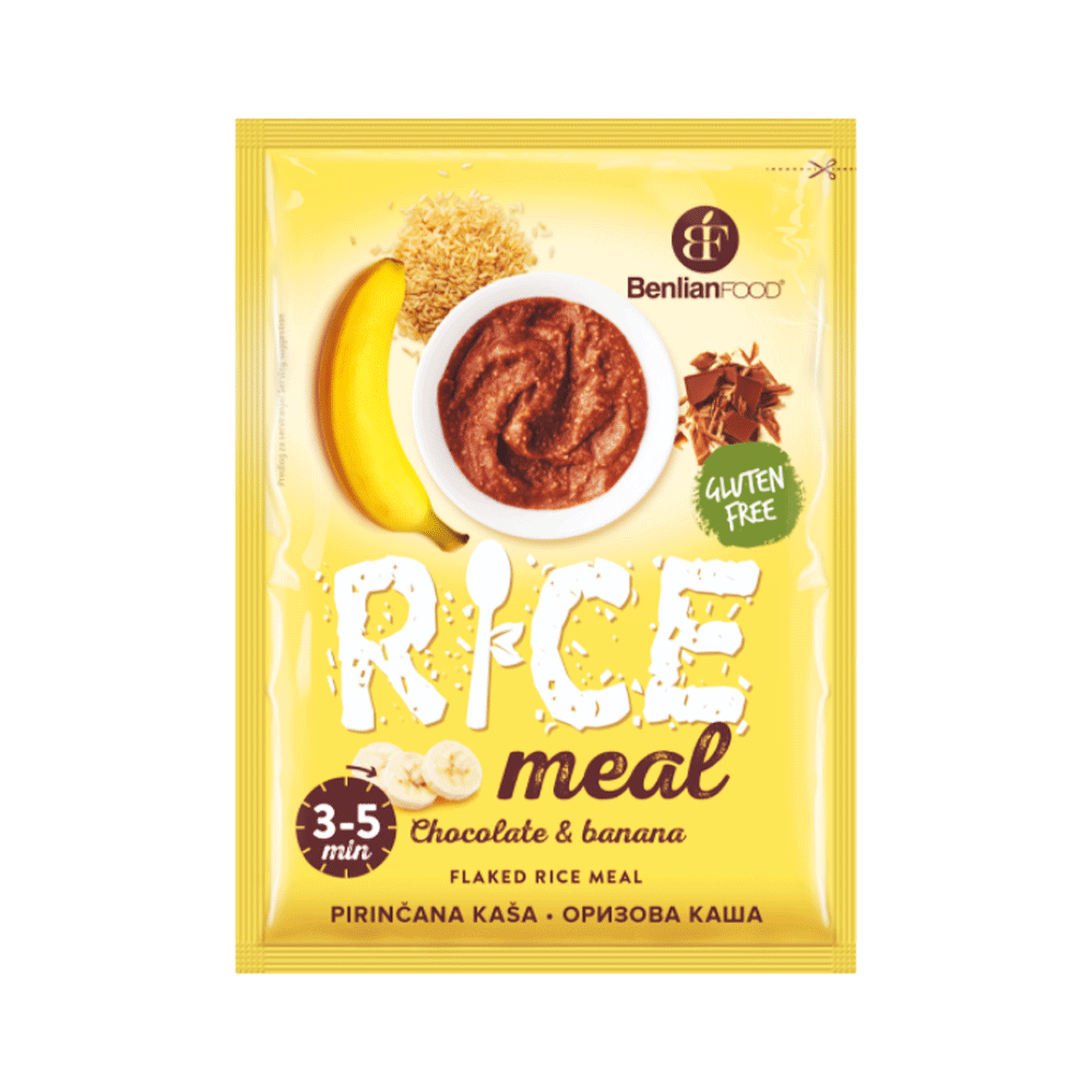 Ingrediente: orez brun expandat si macinat(44%), maltodextrina, lapte praf vegetal, fulgi de ciocolata (10%)(zahar,masa de cacao,cacao degresata,unt de cacao, emulgator: lecitina de SOIA), zahar, pulbere de banane(6%), amidon de porumb, aroma naturala de banane(0,5%),aroma naturala de vanilie.